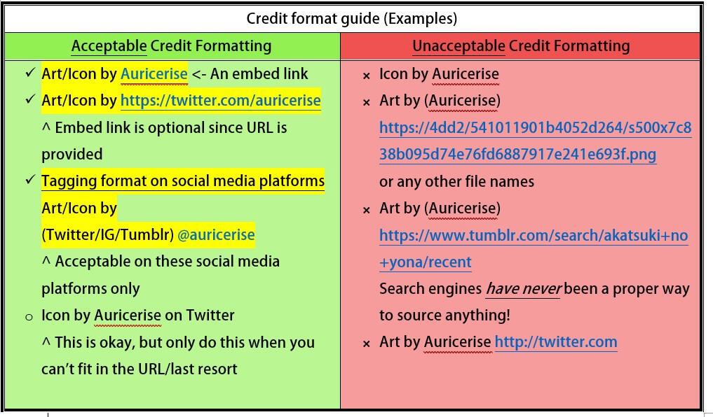 A quick chart to refer to for crediting me, mainly for those unfamiliar with giving credit in general.⭐For the social media pages (the ones where I post my art) you can link me back to, use any of the following:Twitter (preferred): http://twitter.com/Auricerise